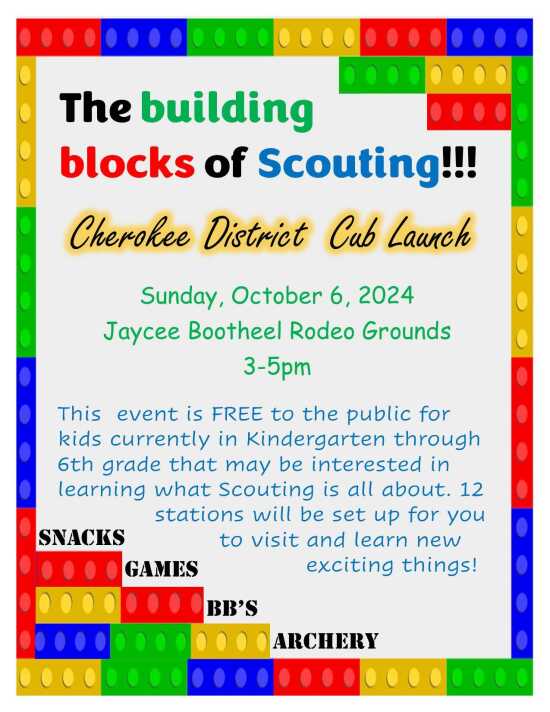 Cherokee district Cub Scouts is hosting their annual cub launch on Sunday, October 6 from 3 to 5 PM at the Sikeston rodeo grounds. This event is a lot of fun and free to the public!! You do not have to be a registered scout to attend, but are able to sign up for Scouting that day!! BB guns, Archery, crafts, snack & this year LOTSA LEGO FUN!!!!!!